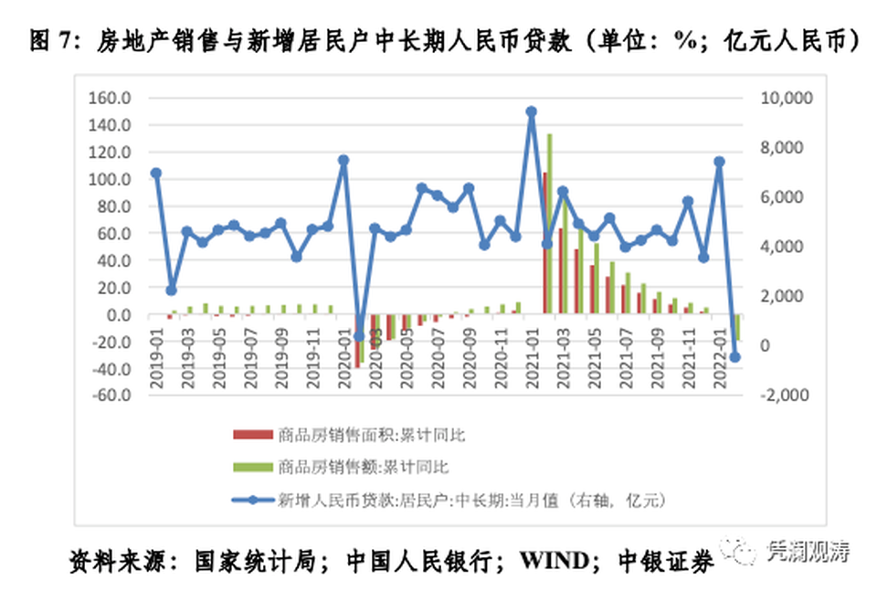 其次,從新增人民幣貸款看,2月份,主要是中長期人民幣貸款按年少增1.05萬億元。中長期貸款少增中,居民户按年少增4790億元,為連續第二個月按年少增,當月新增貸款甚至為負值;企事業單位按年少增5498億元。前者反映了調控政策下房地產銷售下滑的影響(見圖7),後者反映了企業有效貸款需求的不足。3月21日國常會提出,開展政策取向一致性評估,防止和糾正出台不利於市場預期的政策,正是直擊市場痛點。