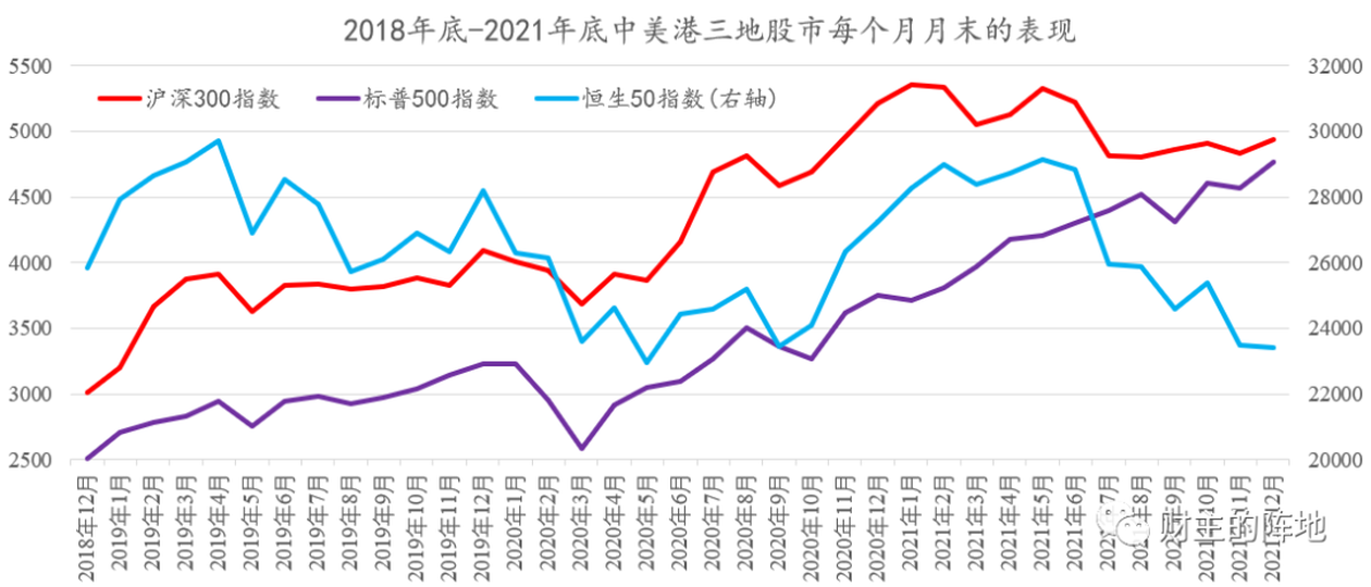 2021年,新冠疫情繼續。這一年,A股的滬深300指數,相比2020年底基本持平,小跌了5%;美股,則是大漲特漲,標普500指數一年中69次創出新高,最終大漲27%;但港股,不好意思,是大跌15%。