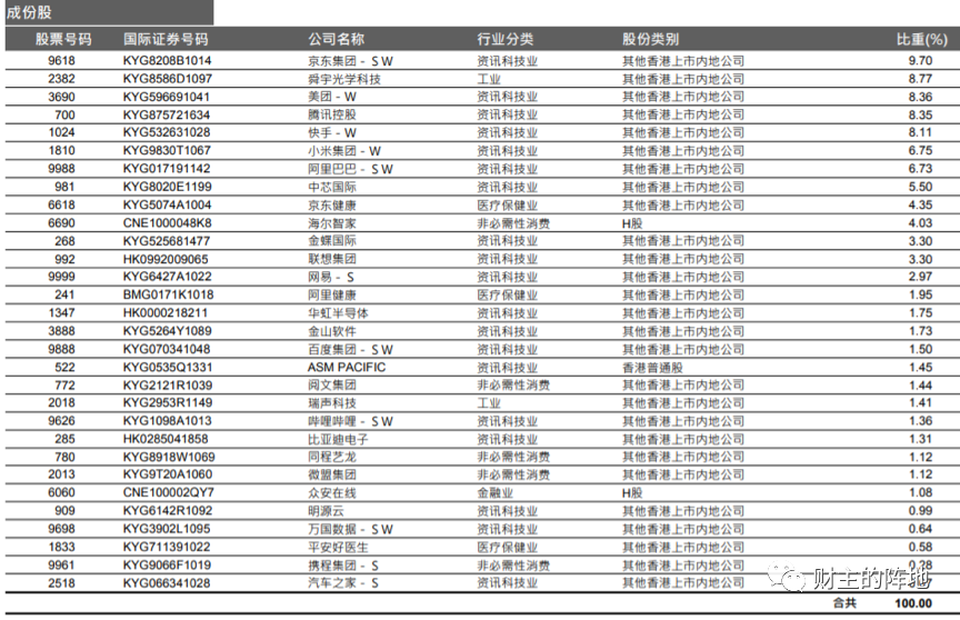 下面的表格,就是最新的恒生科技指數的成分股及其權重構成。