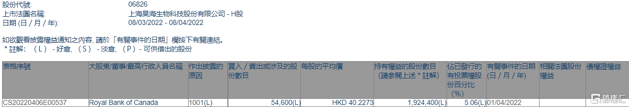 格隆匯APP獲悉,根據聯交所最新權益披露資料顯示,2022年4月1日,昊海生物科技(06826.HK)獲Royal Bank of Canada在場內以每股均價40.2273港元增持5.46萬股,涉資約219.64萬港元。
