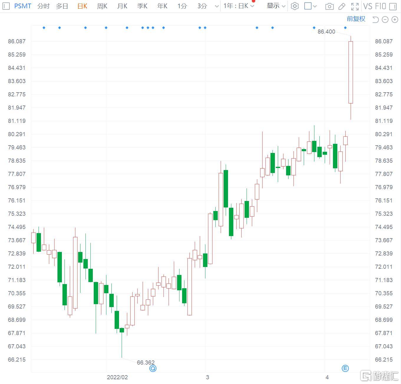 格隆匯4月8日丨普爾斯馬特(PSMT.US)漲7.06%,報85.81美元,總市值3087億美元。公司公佈,截至2月28日,2022年第二財季稀釋後每股淨收益為1.03美元,高於去年同期的0.92美元,同比增11.96%,Capital IQ分析師預測為0.99美元;營收首次超過10.4億美元,高於上年同期的9.376億美元,同比增66.55%。