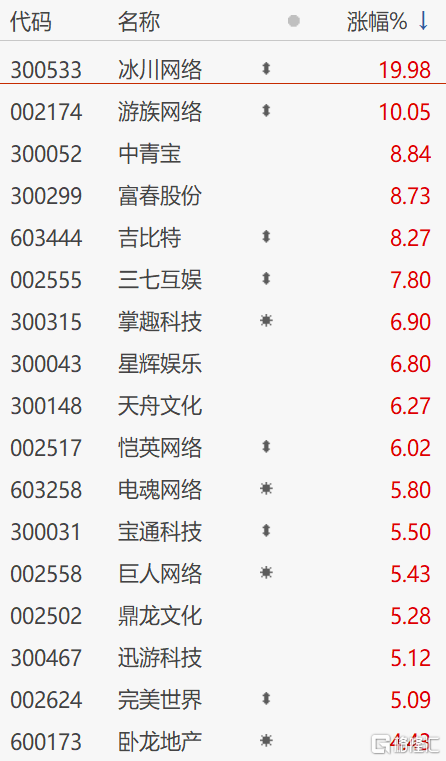 格隆匯4月12日丨冰川網絡漲20%漲停,遊族網絡漲停,中青寶、富春股份、吉比特漲超8%,三七互娛漲近8%,掌趣科技、星輝娛樂、天舟文化、愷英網絡、電魂網絡、寶通科技、巨人網絡、完美世界等跟漲。國家新聞出版署昨晚公佈《2022年4月份國產網絡遊戲審批信息》,這意味着時隔8個月,國產遊戲版號重新啟動核發。2022年首批國產網絡遊戲版號恢復發放,涉及心動公司、三七互娛、吉比特、百度等多家上市公司。業內人士稱,遊戲版號審核重啟後,中小遊戲企業業績壓力有望釋放。中信證券點評稱,隨着遊戲版號恢復發放,遊戲行業整體有望回暖;未來遊戲行業將更傾向於高品質內容的遊戲,研發能力強勁的頭部遊戲公司有望維持競爭力。