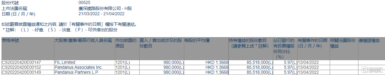 格隆匯APP獲悉,根據聯交所最新權益披露資料顯示,2022年4月13日,廣深鐵路股份(00525.HK)遭FIL Limited在場內以每股均價1.3668港元減持98萬股,涉資約133.95萬港元。