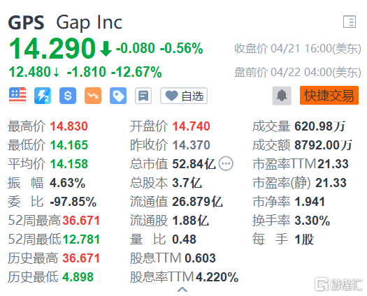美股異動丨Gap(GPS.US)盤前跌12.67% 預計一季度銷售額大減
