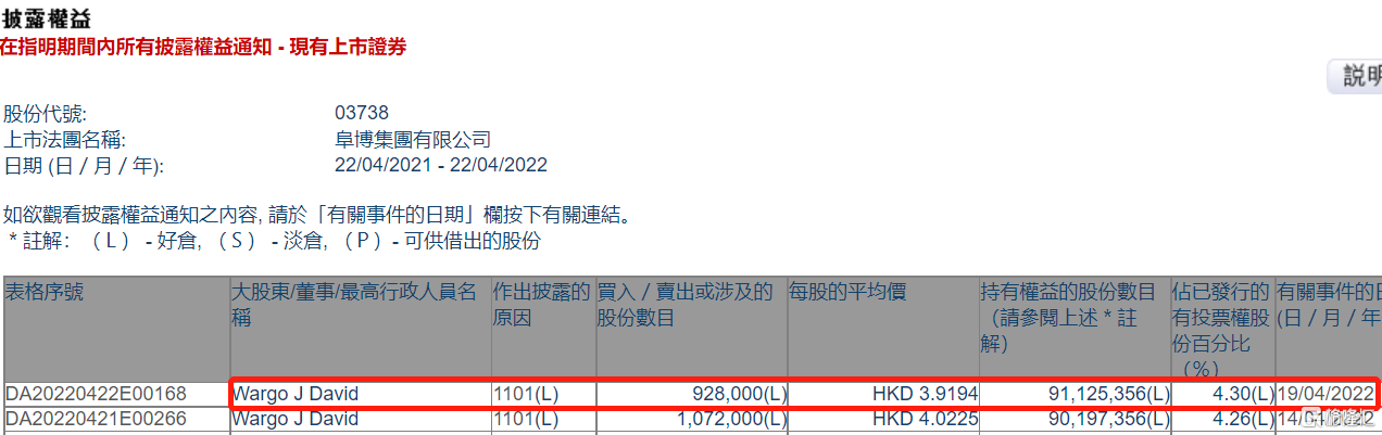 格隆匯APP獲悉,根據聯交所最新權益披露資料顯示,2022年4月19日,阜博集團(03738.HK)獲非執行董事J David WARGO在場內以每股均價3.9194港元增持92.8萬股,涉資約363.72萬港元。