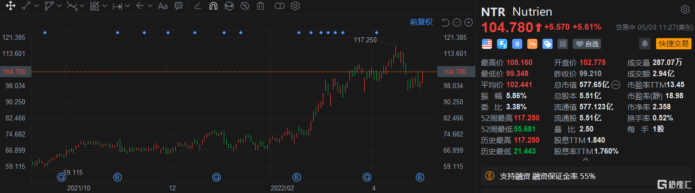 格隆匯5月3日丨化肥巨頭Nutrien(NTR.US)漲5.61%,報104.78美元。該公司昨日盤後發佈業績,第一季度銷售額為76.57億美元,上年同期為46.58億美元,同比增長64%;淨利潤為創紀錄的13.85億美元,上年同期為1.33億美元,同比增長941%。Nutrien同時大幅上調了2022年全年業績指引。Nutrien預計,全年經調整後的EBITDA在145億美元至165億美元,此前為100億美元至112億美元區間;預計經調整後的每股收益為16.20至18.70美元,此前為10.20-11.80美元。