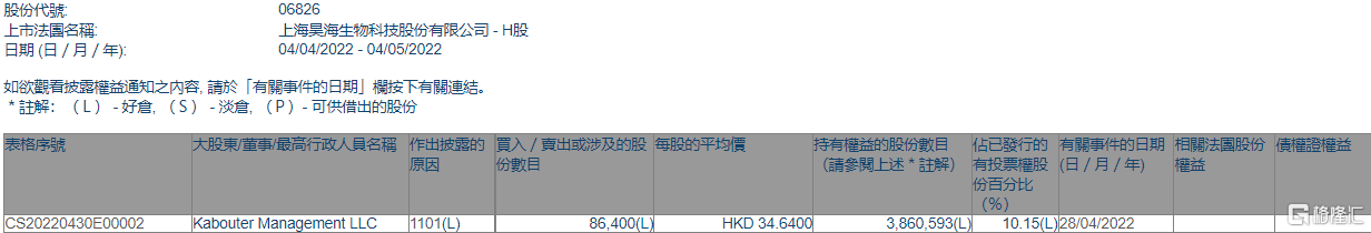 格隆匯APP獲悉,根據聯交所最新權益披露資料顯示,2022年4月28日,昊海生物科技(06826.HK)獲Kabouter Management LLC在場內以每股均價34.64港元增持8.64萬股,涉資約299.3萬港元。