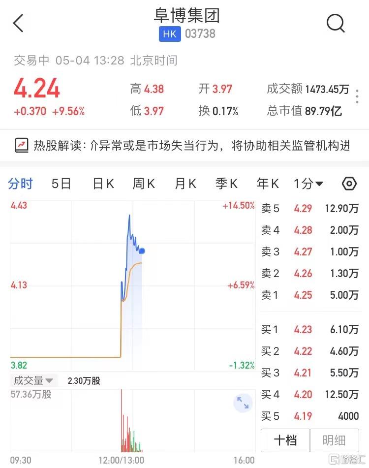 阜博集團(3738.HK)午後復牌一度大漲超13%