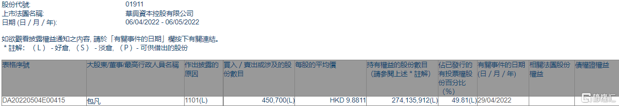 格隆匯APP獲悉,根據聯交所最新權益披露資料顯示,2022年4月29日,華興資本控股(01911.HK)獲執行董事兼董事長包凡在場內以每股均價9.8811港元增持45.07萬股,涉資約445.34萬港元。
