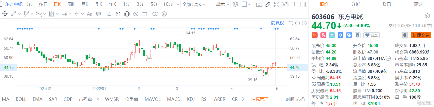 A股異動 | 東方電纜(603606.SH)跌近5% 股東擬減持不超0.81%股份