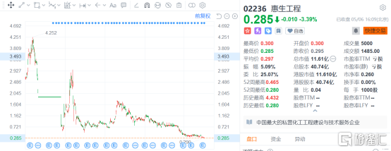 查閲惠生工程歷年的股價走勢可以發現,2013年公司股價最高曾達到4港元,總市值達到上百億。在高層動盪經歷一段時間停牌後,惠生工程股價曾在2015年有過短期上揚,但隨後便一蹶不振。如今已然成為港股眾多老仙股之一,股價僅有0.285港元,總市值也僅有11.61億。