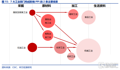 從產業鏈條來看,石油化工與煤化工的下游終端需求主要為機械工業與建材工業。過去一年,石油與煤炭的價格飆漲,PPI快速上行,並通過產業鏈層層傳導至中下游。