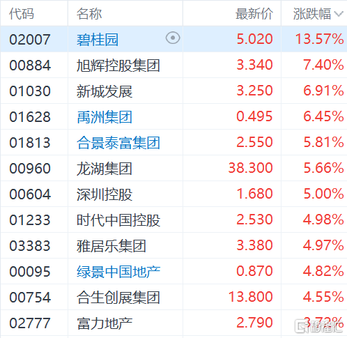 格隆匯5月16日丨港股內房股午後重新走強,目前漲幅正進一步擴大,碧桂園漲超13%,美的置業漲超7%,旭輝控股漲超7%,新城發展、禹洲集團漲超6%,合景泰富、龍湖集團、深圳控股漲超5%,時代中國、雅居樂、綠景中國和合生創展漲超4%。消息面上,碧桂園、龍湖、美的置業三家民營房企被監管機構選定為示範房企,將在本週陸續發行人民幣債券,將同時發行包括信用違約掉期(私募CDS)或信用風險緩釋憑證(CRMW)在內的信用保護工具,以幫助民營地產商逐步恢復公開市場的融資功能。