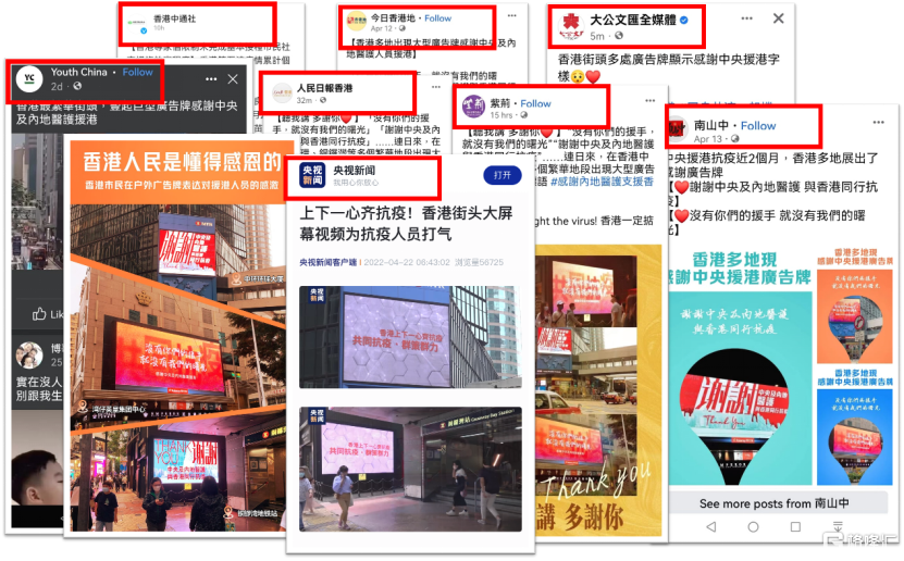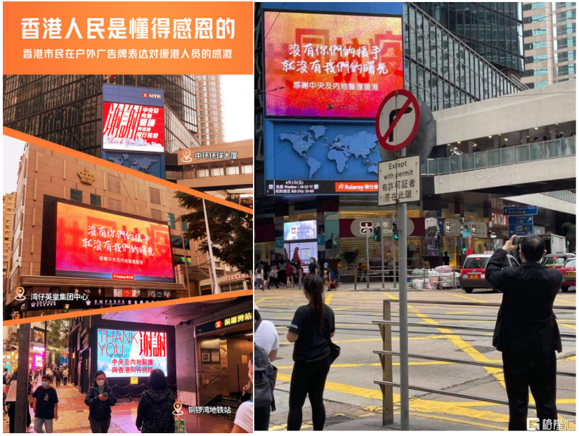 與此同時,近期在香港中環、灣仔、銅鑼灣等最繁華的街頭的巨幅廣吿牌上赫然寫着:“沒有你們的援手就沒有香港的曙光”、“謝謝中央及內地醫護與香港同行抗疫”等。據瞭解,這是香港一些市民為表達對於內地援港人員的感激,專程投放的户外廣吿。