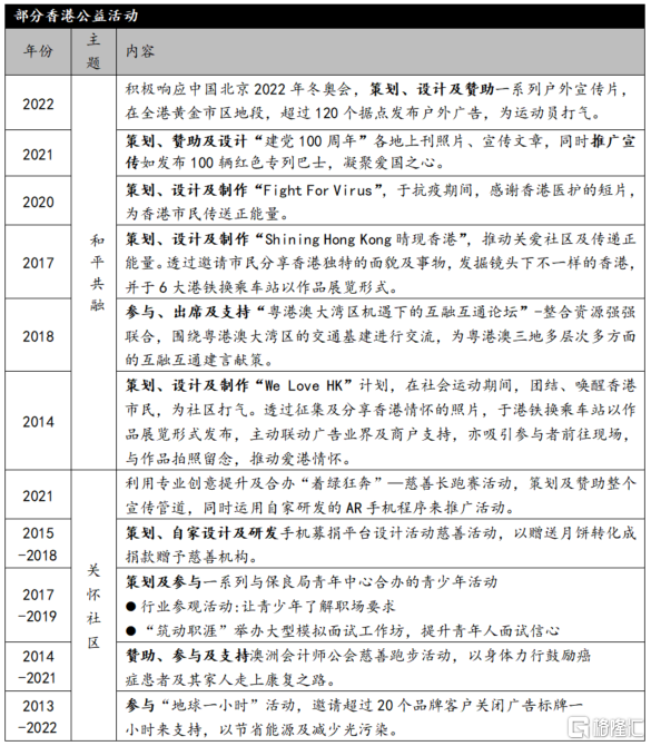 從上述公司過往參與的部分公益活動來看,雅仕維傳媒近二十年來一直都在積極投身公益事業,踐行企業社會責任,且活動領域涵蓋扶貧救濟、醫療衞生、青少年教育、應急救災等多個方面,活動範圍覆蓋香港和內地,稱得上是户外媒體領域的履責築善的範本。