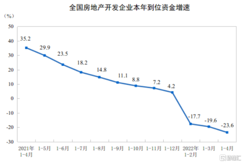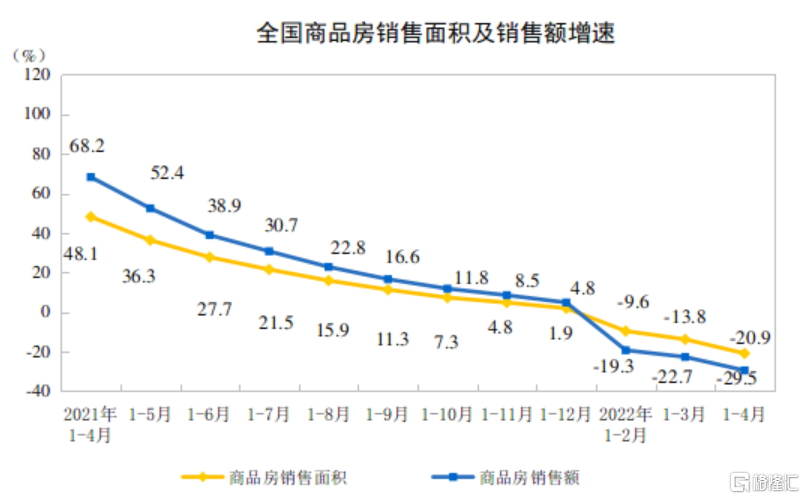 銷售方面,1-4月份商品房銷售面積39768萬平方米,同比下降20.9%;其中,住宅銷售面積下降25.4%。商品房銷售額37789億元,下降29.5%;其中,住宅銷售額下降32.2%。