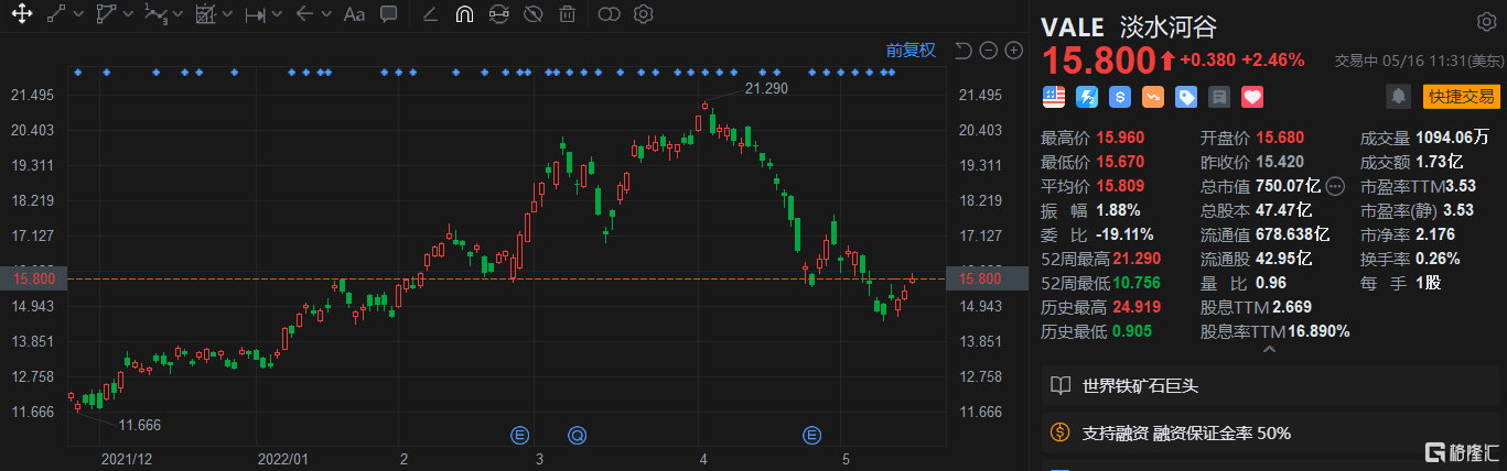美股異動 | 淡水河谷(VALE)逆市漲2.46% 淡水河谷司馬盛:淡水河谷有近1億噸的產能正在恢復之中