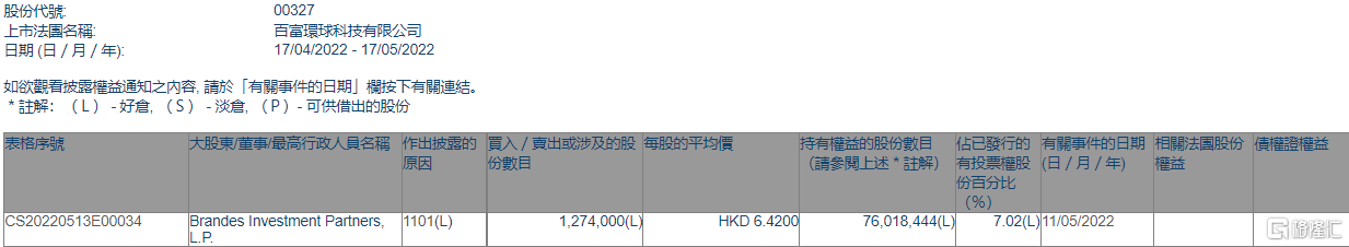 格隆匯APP獲悉,根據聯交所最新權益披露資料顯示,2022年5月11日,百富環球(00327.HK)獲Brandes Investment Partners, L.P.在場內以每股均價6.42港元增持127.4萬股,涉資約817.908萬港元。