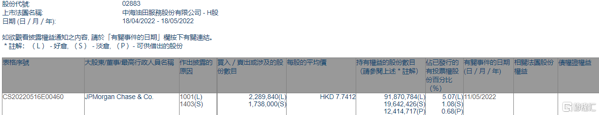 格隆匯APP獲悉,根據聯交所最新權益披露資料顯示,2022年5月11日,中海油田服務(02883.HK)獲JPMorgan Chase & Co.以每股均價7.7412港元增持好倉228.984萬股,涉資約1772.61萬港元。