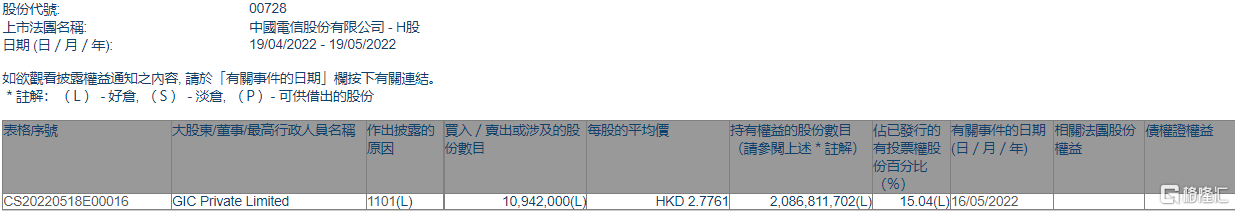 中國電信(00728.HK)獲GIC增持1094.2萬股