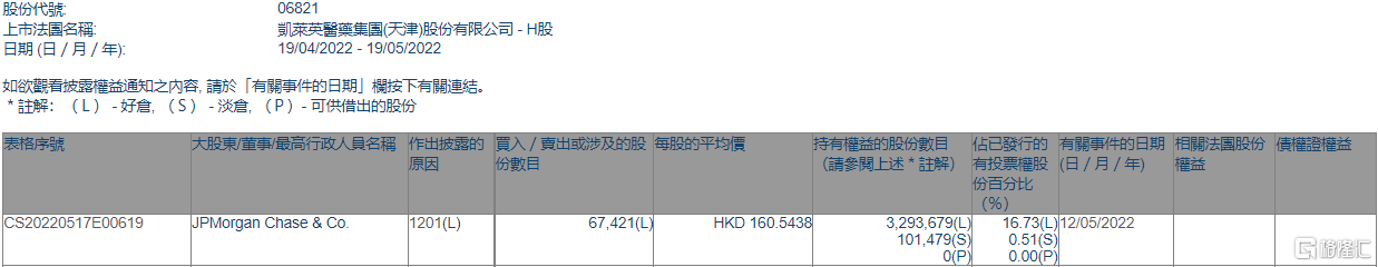 格隆匯APP獲悉,根據聯交所最新權益披露資料顯示,2022年5月12日,凱萊英(06821.HK)遭JPMorgan Chase & Co.以每股均價160.5438港元減持好倉6.74萬股,涉資約1082.4萬港元。