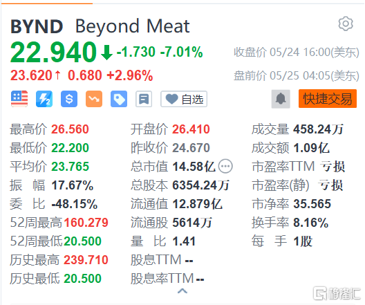 格隆匯5月25日丨Beyond Meat盤前漲約3%,報23.62美元。Beyond Meat週二表示,它正在與金·卡戴珊(Kim Kardashian)合作開展一項新的營銷活動。作為活動的一部分,這位真人秀明星將分享她最喜歡的Beyond Meat產品,其中包括獨家優惠、食譜和其他內容。