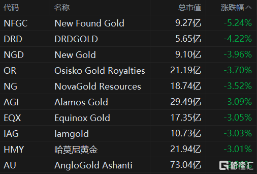 格隆匯5月25日丨美股黃金股走低,New Found Gold跌超5%,DRD黃金跌超4%,New Gold、Osisko Gold Royalties、NovaGold資源、Alamos黃金、Equinox黃金、Lamgold、哈莫尼黃金跌超3%。歐洲央行管委諾特預計今年不會討論縮表問題,並表示6月不會加息。歐元走低,帶動美元指數上升0.54%,黃金現貨價格跌0.87%,報1850.145美元。