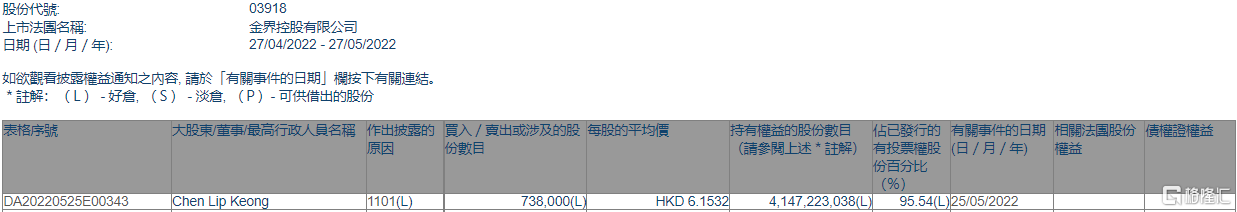 金界控股(03918.HK)獲Chen Lip Keong增持73.8萬股