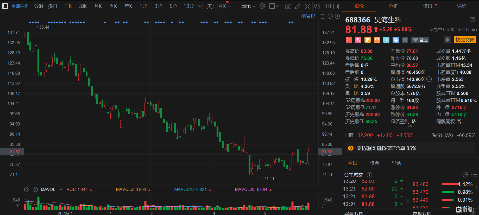 格隆匯5月30日丨昊海生科港股漲4.55%,報32.2港元,A股漲約7%,報81.88元。5月27日,昊海生科在2021年度業績説明會上指出,外用肉毒素目前處於美國臨牀試驗階段。截至2021年12月底,公司擁有20多個在研項目。此外,“眼科+醫美”是公司長期看好的賽道,也將會是公司重點發展的雙引擎。未來,公司將通過努力提升中高端及高端產品的銷售佔比等方式,進一步穩定整體毛利率水平。