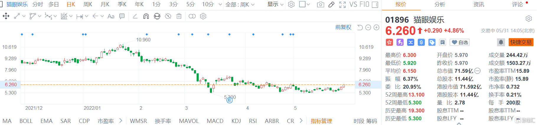 格隆匯5月31日丨昨日大漲近7%的貓眼娛樂(1896.HK)今日繼續走強,現報6.26港元,漲幅4.8%,總市值71.6億港元。大摩研報指,預計短期內有兩個轉折點利好電影業,包括上海、北京和其他城市逐步解封,釋放積壓需求;以及最近確認上映的《侏羅紀世界3》和《外太空的莫扎特》,反映供應面改善。相信貓眼娛樂股價45日內將升,發生此概率料70%至80%,予評級“增持”,目標價8港元。
