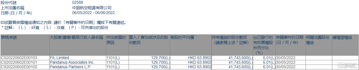 中銀航空租賃(02588.HK)獲FIL Limited增持12.97萬股
