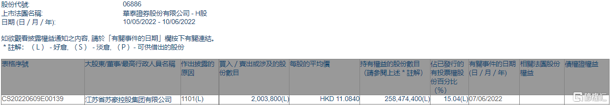 華泰證券(06886.HK)獲蘇豪控股集團增持200.38萬股