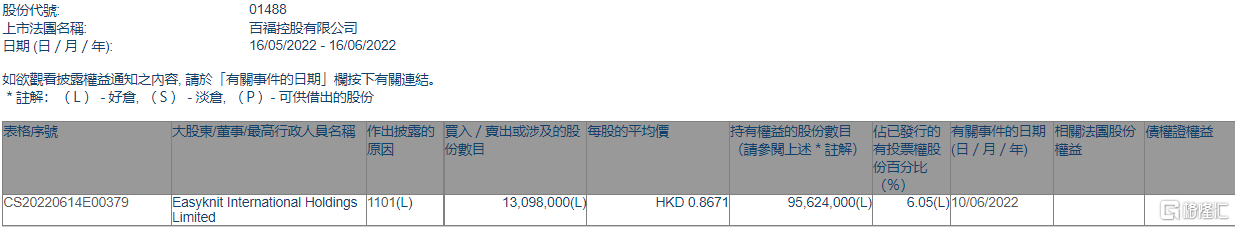 格隆匯APP獲悉,根據聯交所最新權益披露資料顯示,2022年6月10日,百福控股(01488.HK)獲Easyknit International Holdings Limited在場內以每股均價0.8671港元增持1309.8萬股,涉資約1135.73萬港元。