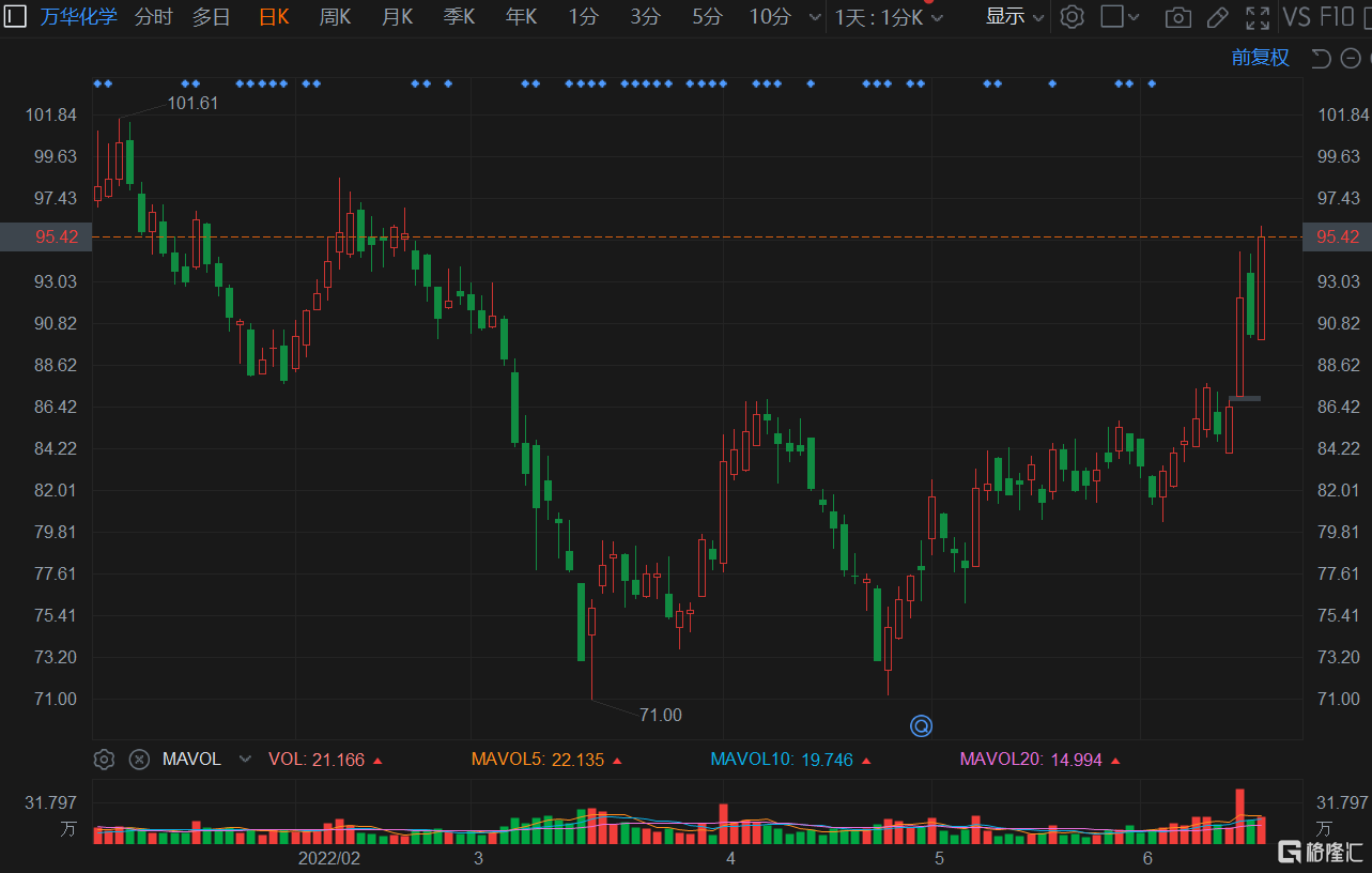 A股異動 | 萬華化學(600309.SH)漲約6% 北上資金加倉+機構唱好