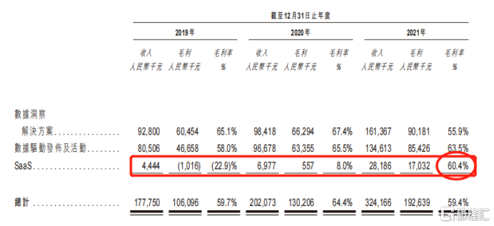 隨着公司新SaaS產品的不斷推出,以及三大業務之間協同效應的愈發明顯,SaaS業務的收入進入指數增長階段。從2019年的444.4萬元大漲57%至2020年的697.7萬元,隨後在2021年開啟爆發式增長,大增304%,至2818.6萬元,並且毛利率達到60.4%。