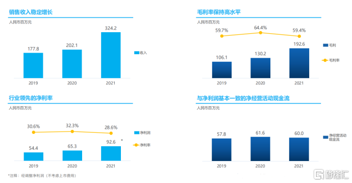 同時,公司的毛利率和淨利率也一直維持在較高水平,2021年毛利率為59.4%,經調整淨利率為28.6%。在實現毛利潤和淨利潤大幅增長的同時,能保持毛利率和淨利率在高水平的穩定,實屬難得,説明公司業務的擴張具備較強的可複製性。