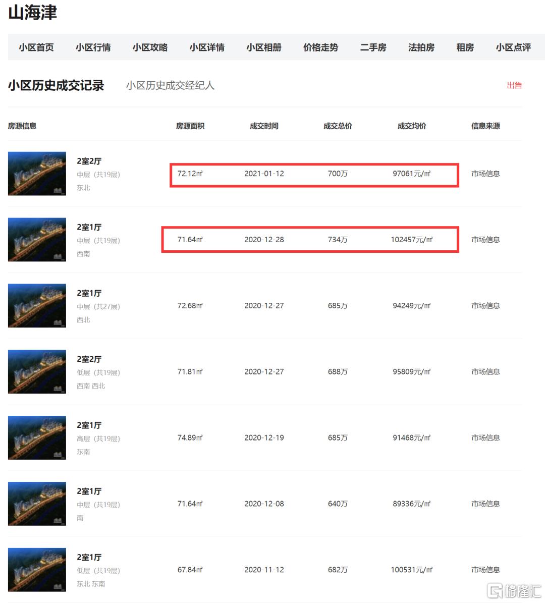 距離項目直線距離約370米的山海津,當前市場報價約9-11萬/平,而實際成交價格在9-10萬/平。