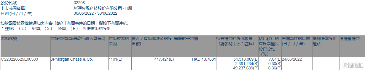 格隆匯APP獲悉,根據聯交所最新權益披露資料顯示,2022年6月24日,金風科技(02208.HK)獲JPMorgan Chase & Co.以每股均價13.7681港元增持好倉41.74萬股,涉資約574.71萬港元。