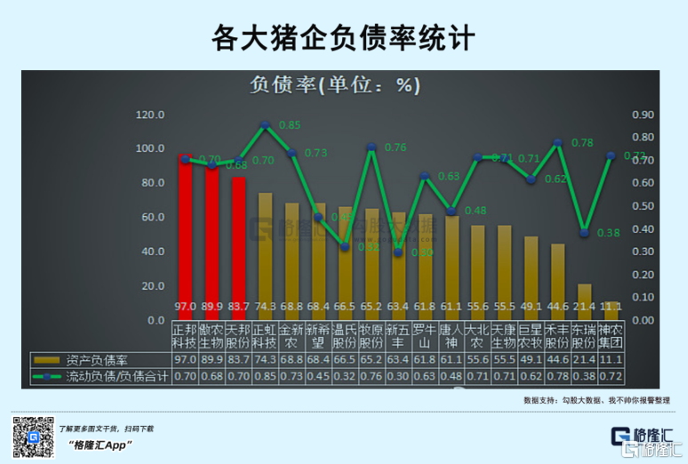 其次,非瘟後,行業負債水平越來越高,引發行業融資信用大幅鋭減,處於歷史最低水平。2022年一季度末,正邦、傲農、天邦、新希望、温氏,資產負債率分別為97%、89.9%、83.7%、68.4%、66.5%。這遠超豬企負債率紅線水平,還有3家超80%,很大概率已經不能從外界融到資金了。上市公司如此,大中型養殖場能好到哪裏去?