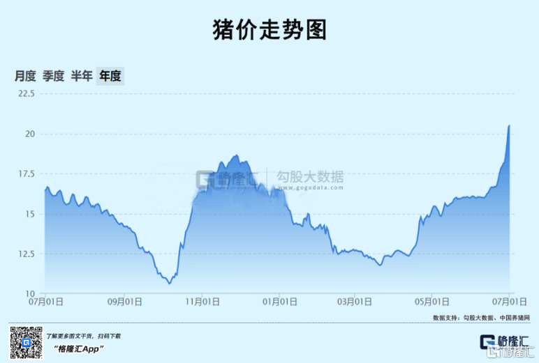 首先看豬價。7月1日,生豬現貨價格已經快速飆升至20.5元,而6月12日僅僅16元。短短18天,豬價暴漲28%。現價較3月20日的11.8元暴漲73.7%。