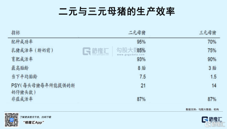在我看來,依據能繁母豬數據來判斷豬週期很不靠譜。在過往正常豬週期中,三元母豬(商品代肥豬直接留種當能繁)佔能繁母豬總量區區只有百分之幾,二元母豬佔比高達90%以上。兩者生產效率差距實在太大。其中,影響成本最關鍵的PSY,二元母豬每胎是21頭斷奶仔豬,而三元母豬僅僅只有14頭。