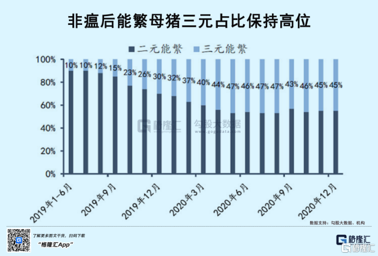 2018年下半年爆發非瘟之後,中國核心種豬羣遭遇嚴重破壞。能繁母豬總量從爆發非瘟之前的3300萬+快速滑落至1900萬頭,較正常年份去化高達50%左右。不管是上市豬企,還是養殖場,還是農民,均預期未來高豬價會持續很久,便瘋狂擴張產能,但又沒有能繁母豬,結果就直接留種育肥豬當正常母豬用(即三元母豬)。因此,三元能繁佔比走高,在2020年一季度後高達45%左右。即便是現在,三元佔比仍然不低。這亦是非瘟後行業平均養殖成本大幅提升的核心邏輯。能繁母豬數據夾雜着大量低效能三元,以此數據來判斷豬週期拐點其實已經喪失了意義,且有可能會誤導。