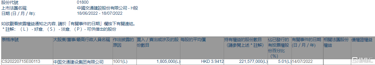 格隆匯7月18日丨根據聯交所最新權益披露資料顯示,2022年7月14日,中國交通建設(01800.HK)獲中國交通建設集團有限公司在場內以每股均價3.9412港元增持180.5萬股,涉資約711.39萬港元。