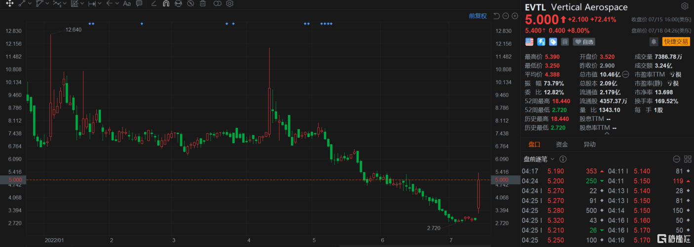 格隆匯7月18日丨電動垂直起降飛行器開發商Vertical Aerospace(EVTL.US)盤前續漲8%,報5.4美元。公司上週公佈,已從FLYINGGROUP獲得近50架VX4飛行器的預購。公司稱,該訂單將公司的有條件預購訂單增加到多達1400架飛行器,總價值56億美元。