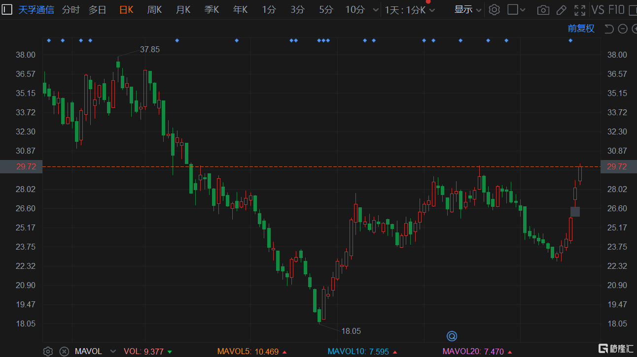A股異動 | 天孚通信(300394.SZ)連續6日上漲 區間升幅達30%走出反轉行情