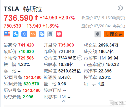 格隆匯7月20日丨特斯拉(TSLA.US)盤前漲約2%,報750.53美元。特斯拉CEO馬斯克20日凌晨發佈微博稱,特斯拉弗裏蒙特工廠+內華達超級工廠已累計生產200萬輛車。馬斯克還表示,如今,特斯拉弗裏蒙特工廠是北美最大的汽車工廠。此外,華爾街最不看好特斯拉的分析師剛剛上調了該公司目標股價。GLJ Research的分析師戈登-約翰遜將特斯拉目標價從67美元上調至73美元。