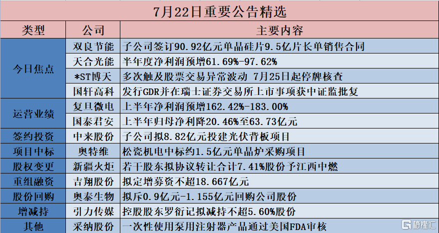 格隆匯公吿精選︱雙良節能子公司簽訂90.92億元單晶硅片合同;復旦微電上半年淨利預增162%-183%;*ST博天股票停牌核查