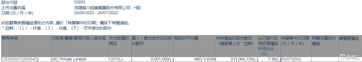 格隆匯7月26日丨根據聯交所最新權益披露資料顯示,2022年7月20日,洛陽鉬業(03993.HK)遭GIC Private Limited在場內以每股均價3.8396港元減持500.1萬股,涉資約1920.18萬港元。