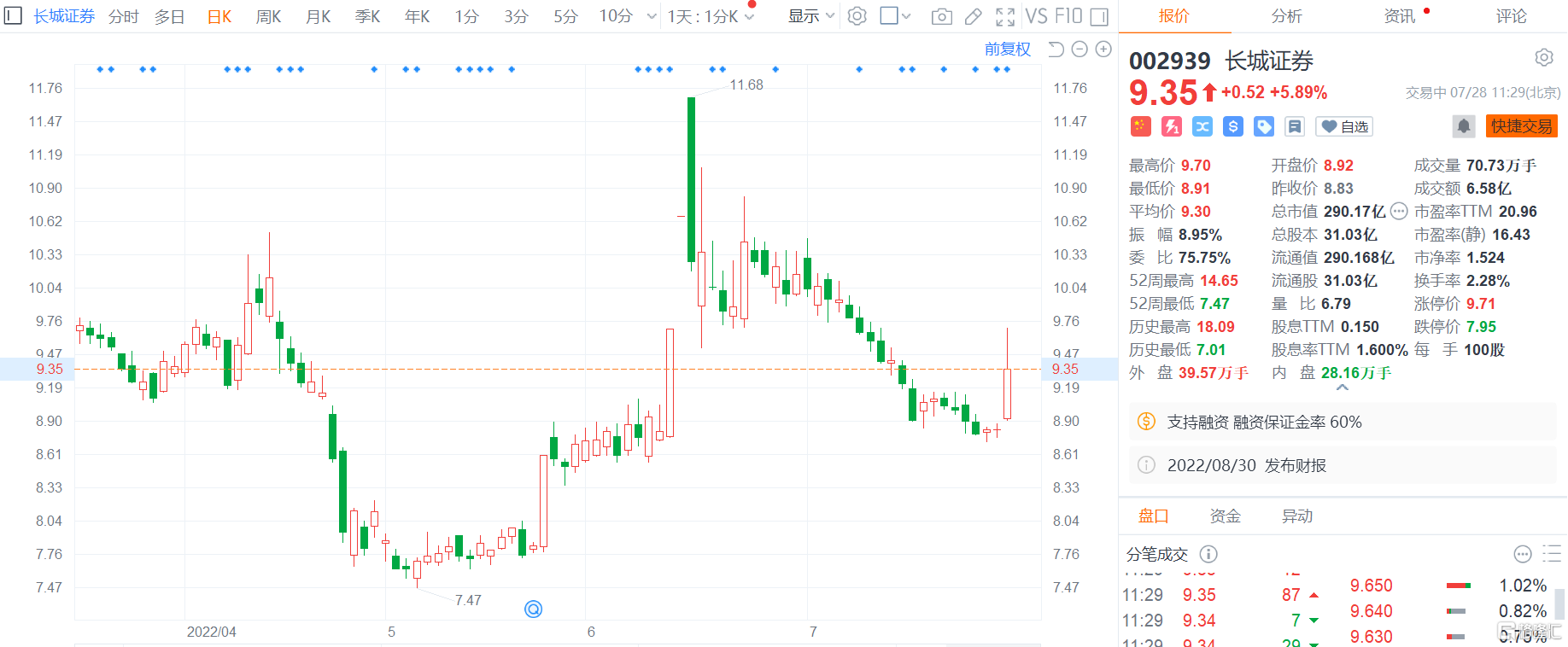 格隆匯7月28日丨長城證券漲近6%,報9.35元,總市值290億元。