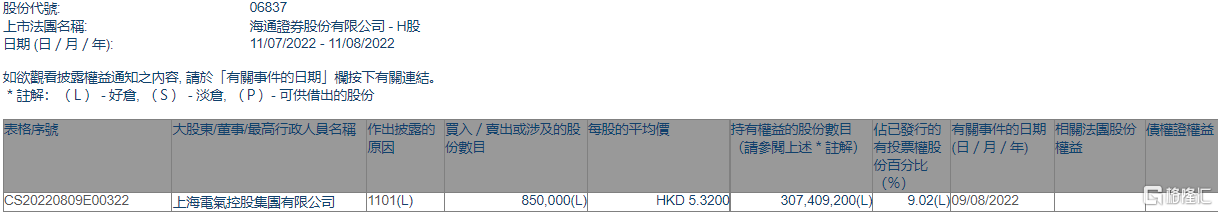 海通證券(06837.HK)獲上海電氣控股集團增持85萬股